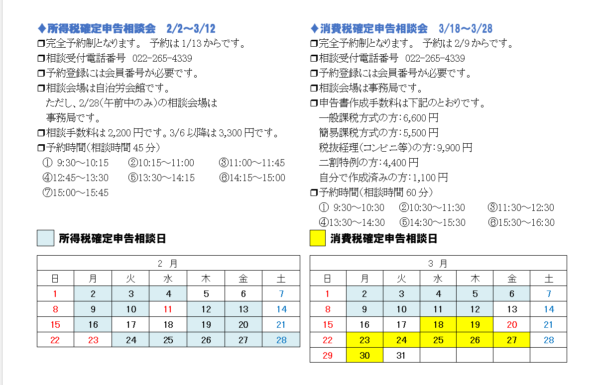 | 今年も完全予約制となります。 予約状況はこちらから>>> そのため一回の相談時間が45分に限られます。所得税の申告書の作成以外は困難ですので、消費税の申告は基本的に3月18日以降での対応とさせていただきます。予めご了承ください。早めに準備を行い、スムーズな確定申告を目指しましょう! なお、今年もご来場のたびに特別相談料を頂戴いたします。時間内に終わらない場合には、次回とさせていただきます。 パソコンを持ち込んでの記帳相談はお受けできませんので、申告前に聞いておきたいことがございましたら、必ず事前相談会(詳細は裏面のとおり)にお越しください。 ◆65万円の青色申告特別控除の適用を受ける方は、電子申告(e-tax)による申告又は 電子帳簿保存の承認を受けているが条件となっていますので、電子帳簿保存の承認申請書の 控えをお持ちいただくか、予約時に電子申告でお申し込みください。 ◆年金の受給を受けている方は、必ず源泉徴収票をお持ちください。紛失された方は事前に再発 行の手続きをお願い致します。 ◆土地や家を売った、マイホームの購入のため借入を行った、株の売買等を行った等、特殊事情 がある方につきましては、事前に税務署等でご相談していただき申告書第3表・計算書・必要 書類等を揃えてお越しください。未作成の場合でも、当会では作成いたしません。 ◆国民年金保険料、生命保険料、地震保険料、小規模企業共済の掛け金につきましては、控除 証明書の添付が必要となりますので紛失された方は再発行の手続きをお願い致します。 【持参するもの】 ①令和5年・令和6年分の決算書・申告書の控え ②会員証 ③令和7年中に取得した減価償却資産の明細書(10万円以上) ④その他決算に必要な書類(棚卸表、未収金の明細書等) ⑤税務署からのお知らせ(はがき又は封書) ⑥各所得控除の証明書等 ⑦マイナンバー関係書類及び身分証明書のコピー ⑧令和7年分確定申告書・決算書 ⑨年会費・特別相談料 ⑩ブルーリターンAをご利用の方は、バックアップデータの入ったUSBメモリ ◎今年も完全予約制のため、予約が集中する最終日近くは予約がとれるかはわかりません。 予約が遅くなりますと空きがなく予約がとれない恐れがございますので、お早めに電話にてご 予約ください。申告は余裕をもって、お早目にお越しくださいますようお願い致します。 なお、予約日以外は、相談受付は致しかねますのであらかじめご了承ください。 | ||